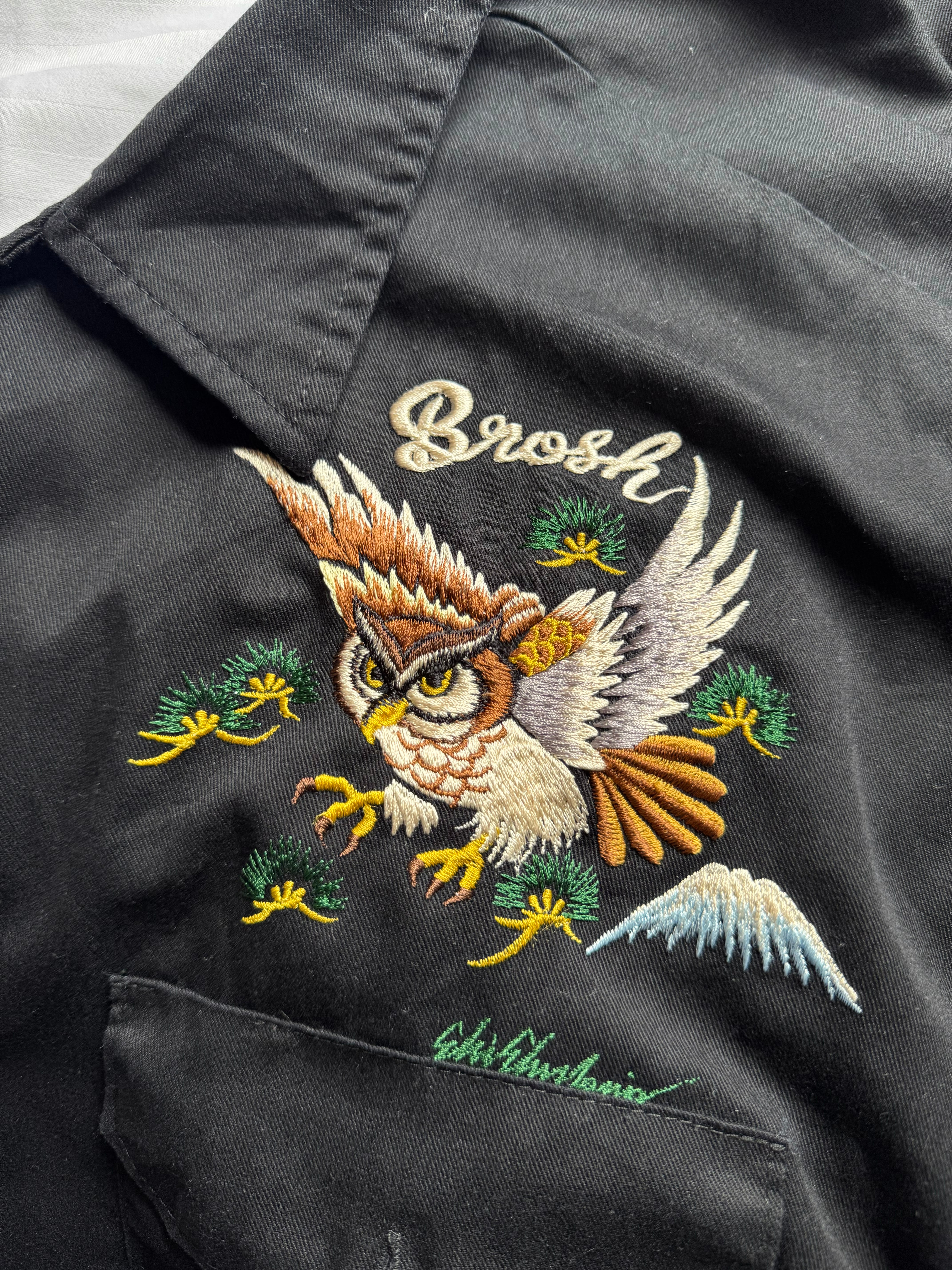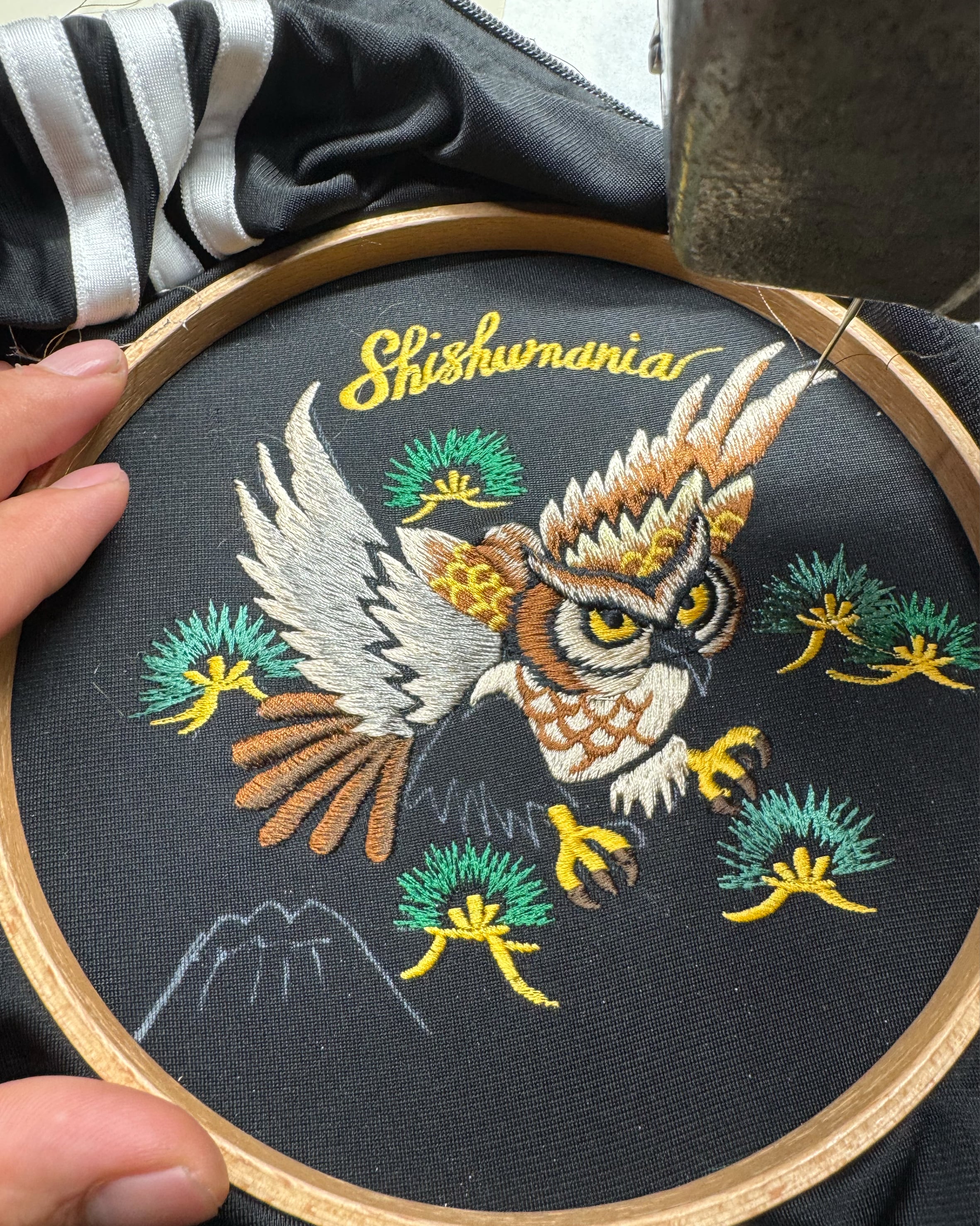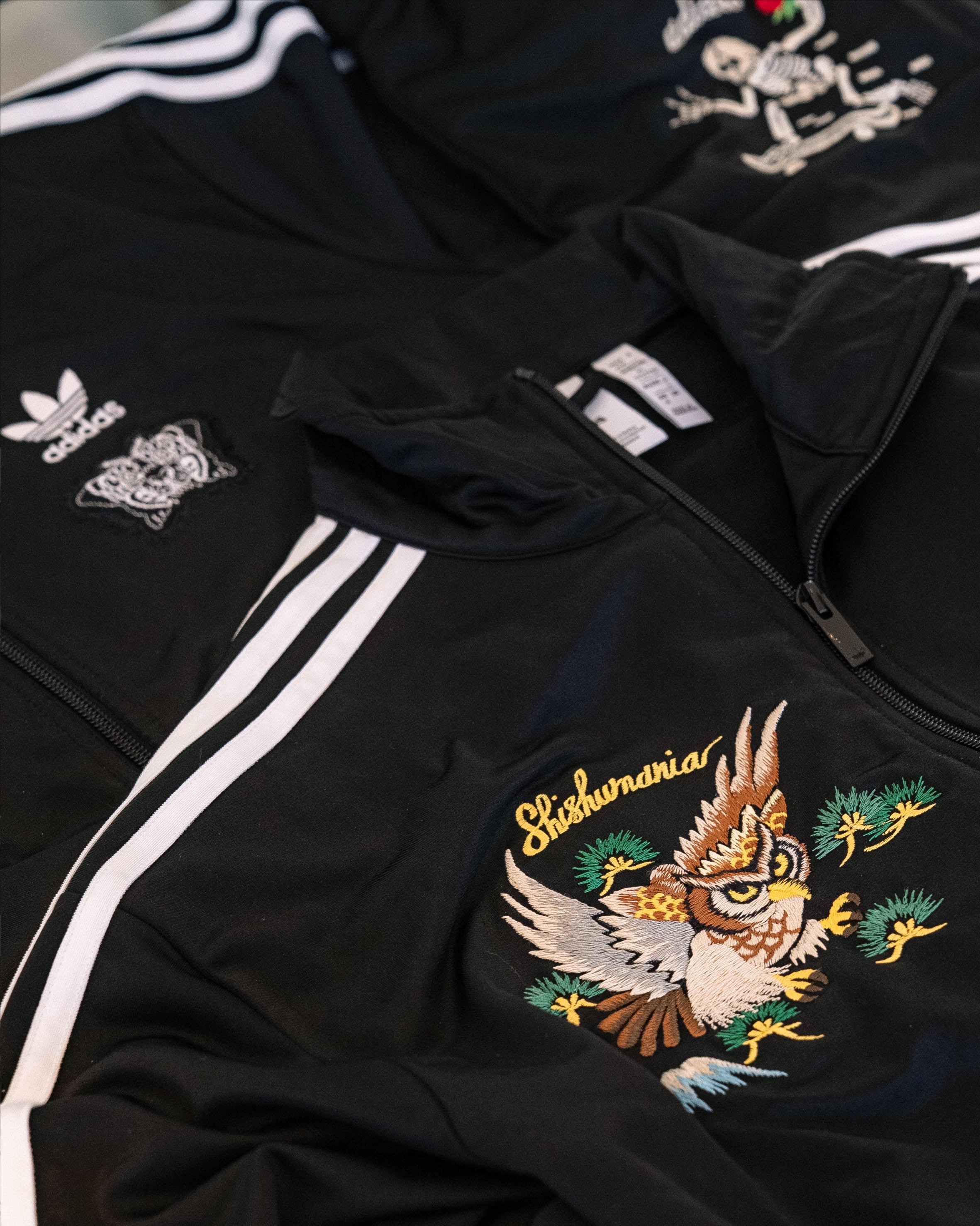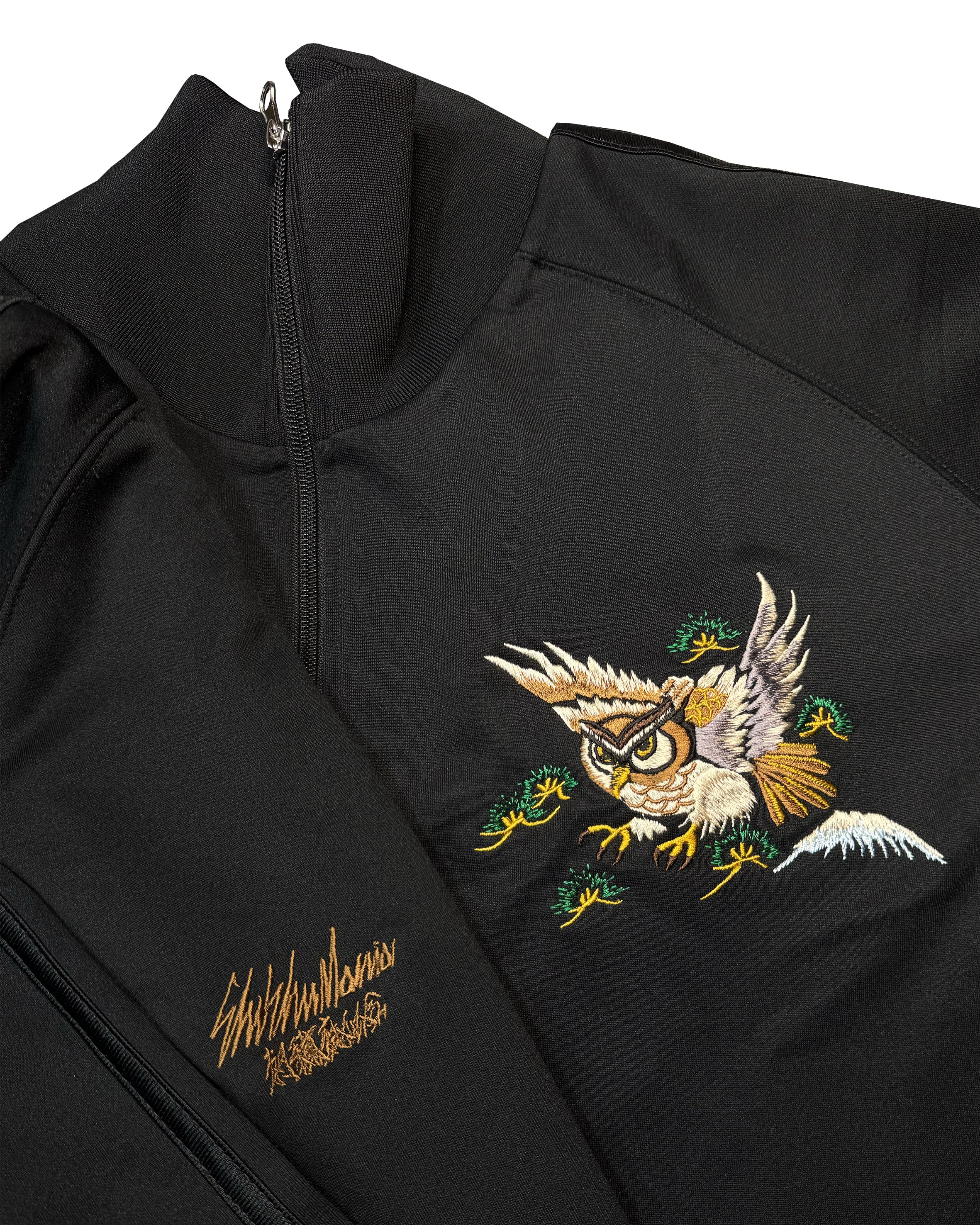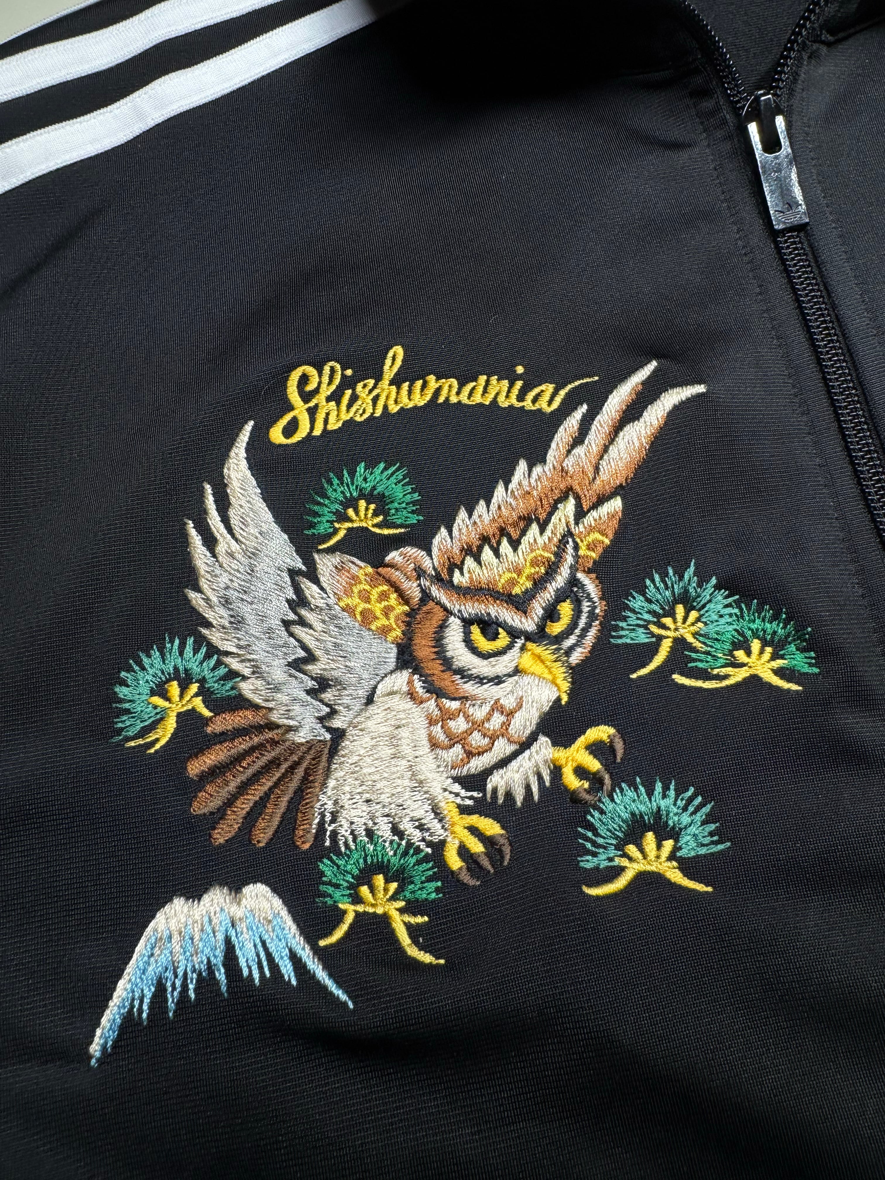 スカジャン風にデザインした、SHISHUMANIAオリジナルのフクロウデザインの刺繍、ロゴ刺繍の入ったジャージです。羽織るだけでスタイルが決まるので、季節の変わり目や肌寒い日にも大活躍の1枚です。
