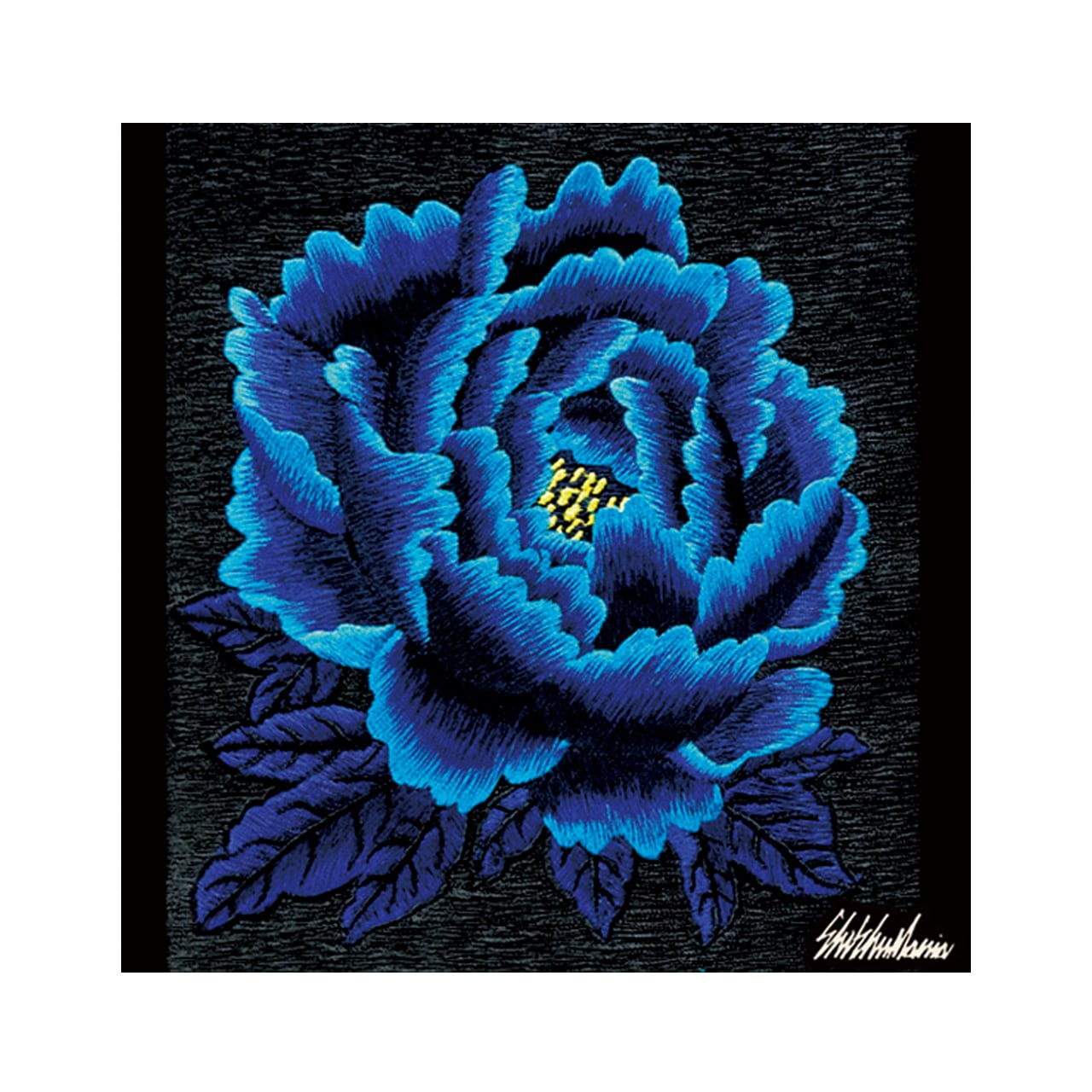 横振りミシンで刺繍した作品「青牡丹」を、どこにでも手軽に貼れるようにステッカー化しました。