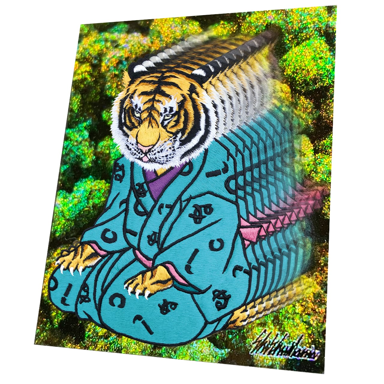 横振りミシンで刺繍した作品「Looping Tiger」を、どこにでも手軽に貼れるようにステッカー化しました。