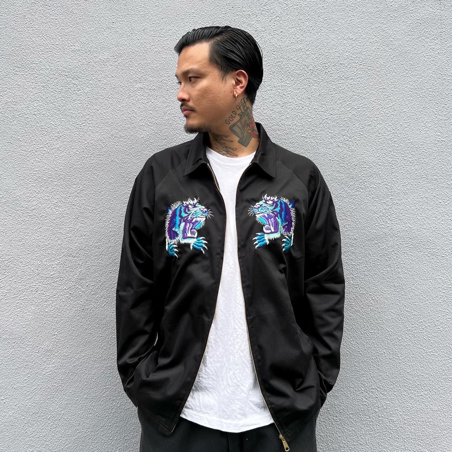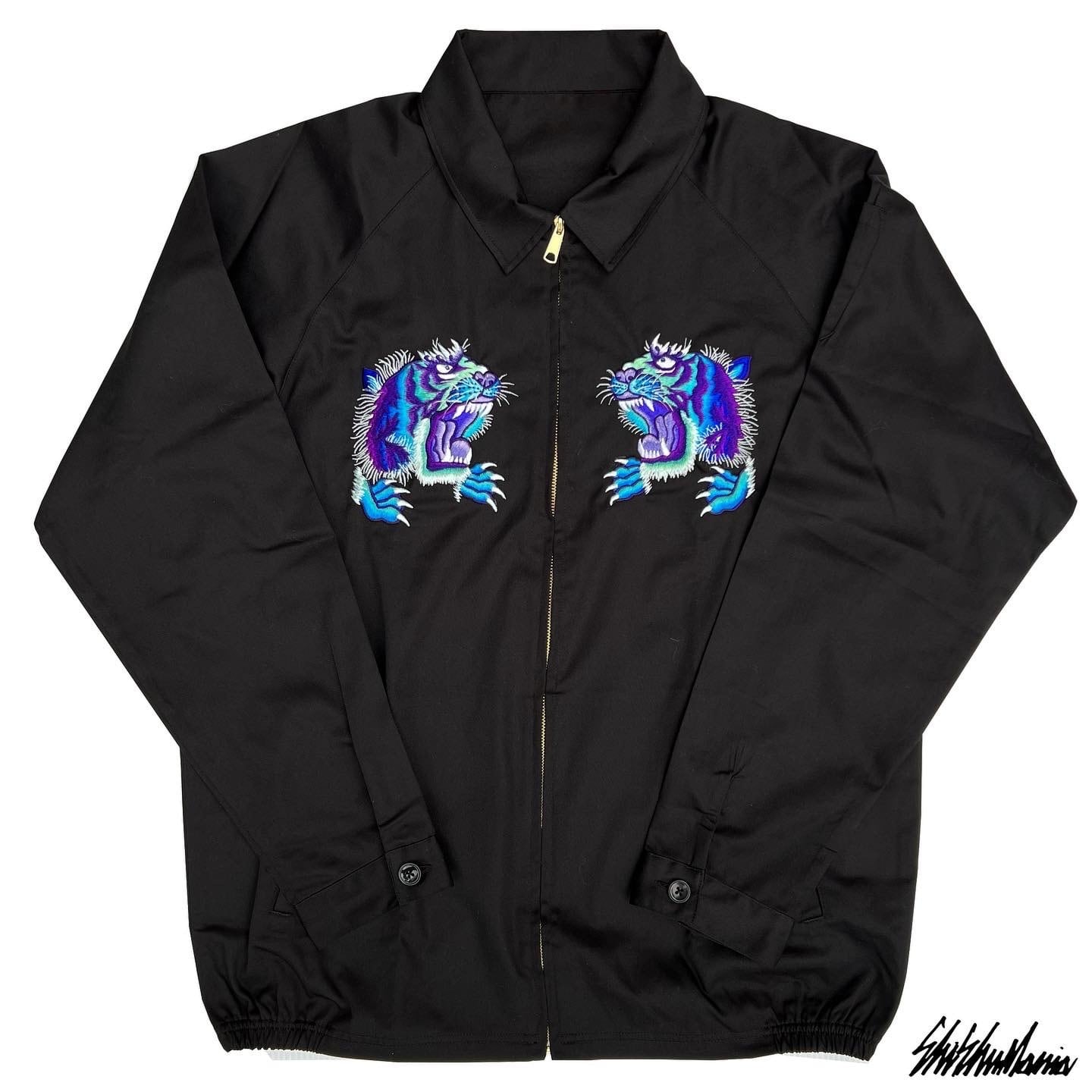 横振りミシンでハンドメイド刺繍した1点ものです。 【素材】 ポリエステル65%綿35% 【サイズ】XL着丈 約80cm / 身幅 約62cm / 裾幅 約52cm / 袖丈 約83.5cm