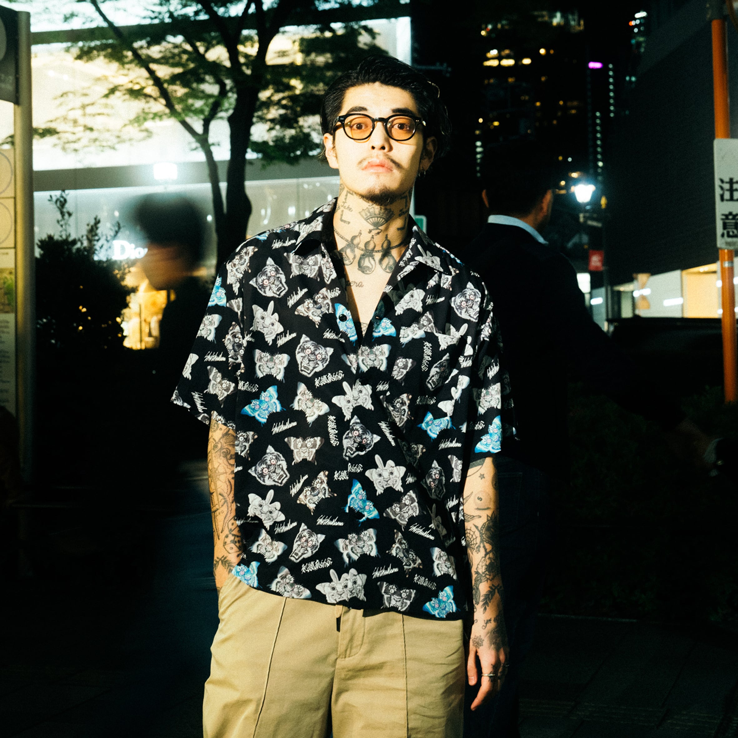 光沢が綺麗なサテン生地を使用した総柄シャツです。