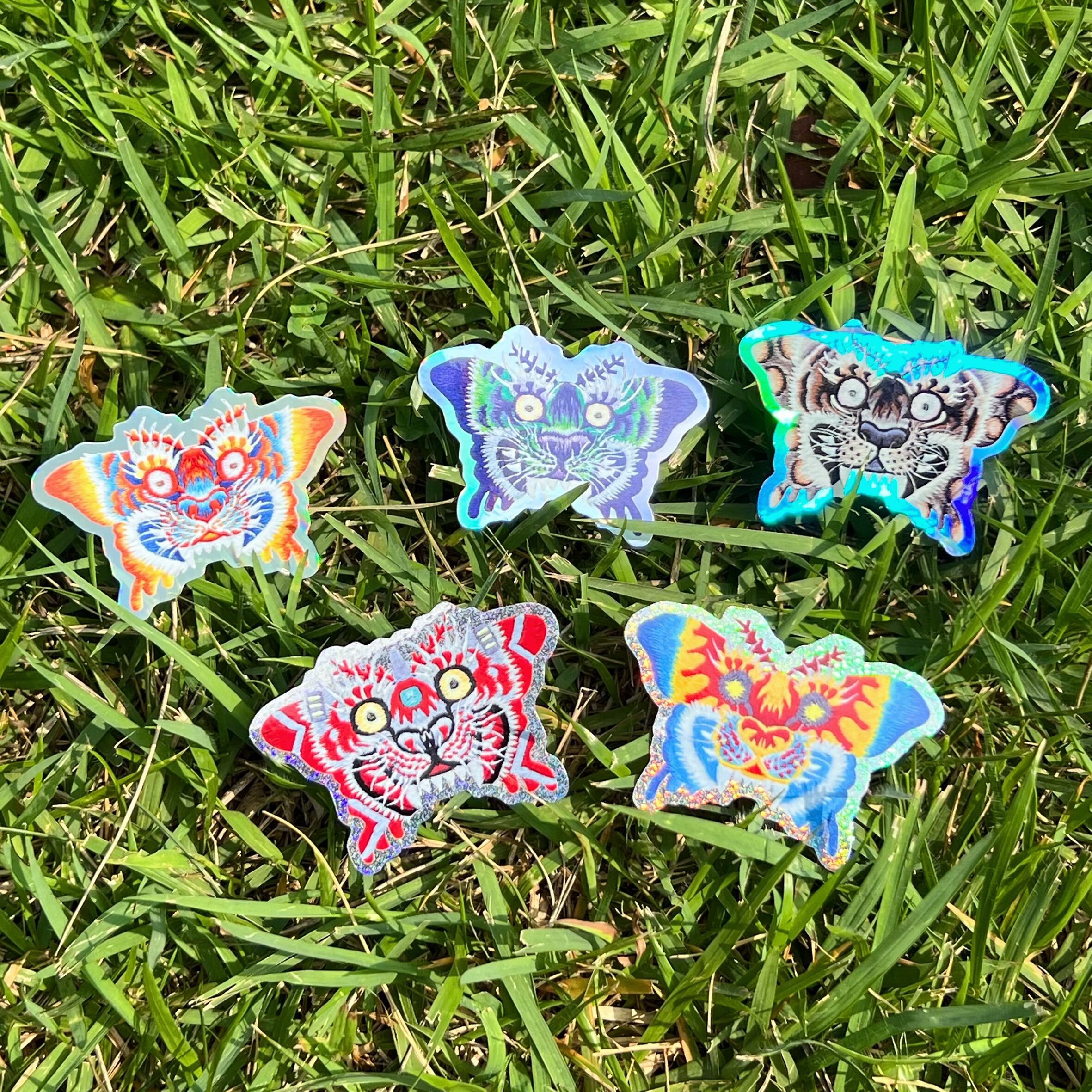 横振りミシンで刺繍した作品「蛾虎」を、どこにでも手軽に貼れるようにステッカー化しました。