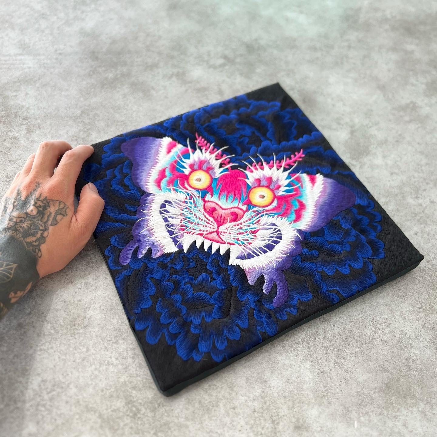 一人だけ熱心に見てくださるお客様がいらっしゃったので、どうせ帰るのなら新作の「蛾虎」を刺繍して帰ろうと思い、3時間かけて目の前で蛾虎を刺繍しました。