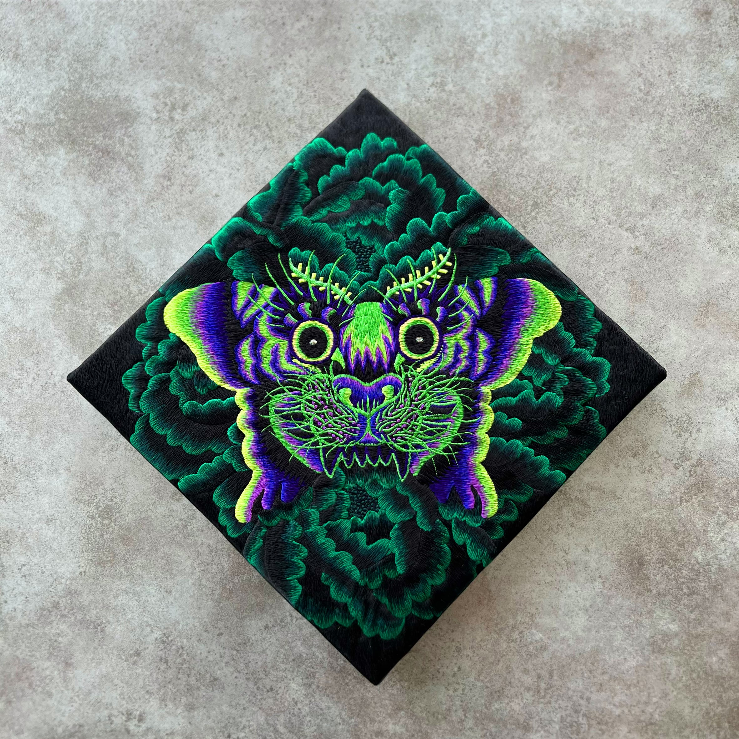横振りミシンで刺繍した作品「蛾虎」を、どこにでも手軽に貼れるようにステッカー化しました。